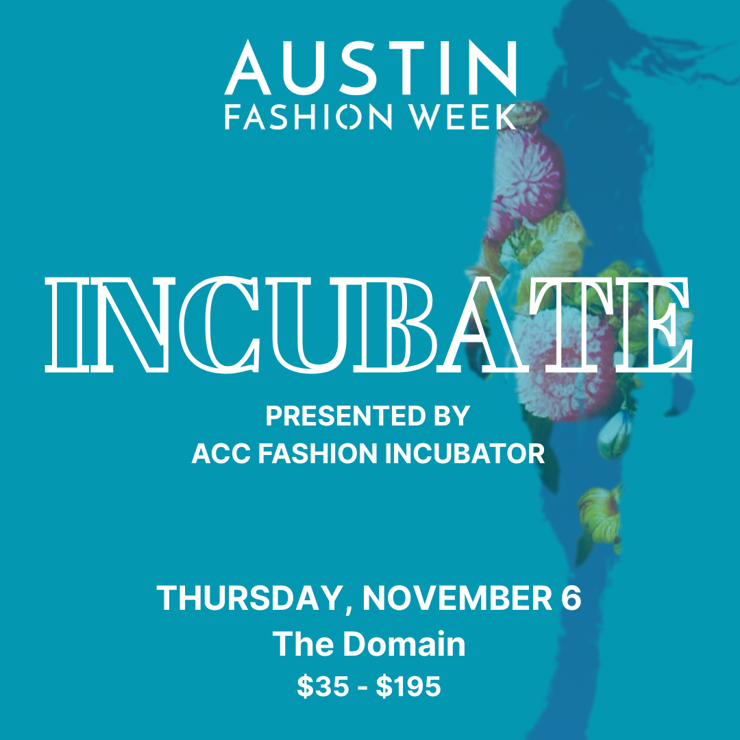 INCUBATE Presented by the ACC Fashion Incubator tickets give you runway seating (based on the row/level you choose) for the runway show on Thursday, November 6 at 8:00 pm at The Domain. VIP upgrades are available and include access to the VIP Lounge along with an open bar. Doors, VIP, Pop Up Shops all open at 6:00 pm.